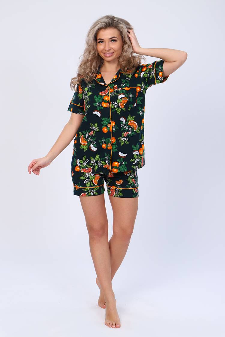Трикотажный домашний костюм с ярким тропическим принтом, состоящий из кофты с коротким рукавом и шорт. Кофта застегивается на пуговицы, имеет красивый отложной воротник, на груди слева накладной карман, на рукавах манжеты, обработанные ярким атласным кантом. Шорты на мягкой резинке, с удобной посадкой, снизу манжета, обработанная кантом, без карманов. Костюм не стесняет движений, ткань мягкая, приятная к телу. Благодаря натуральному составу ткани в нем будет комфортно и удобно провести весь день, а ночью костюм станет гарантией спокойного и крепкого сна.